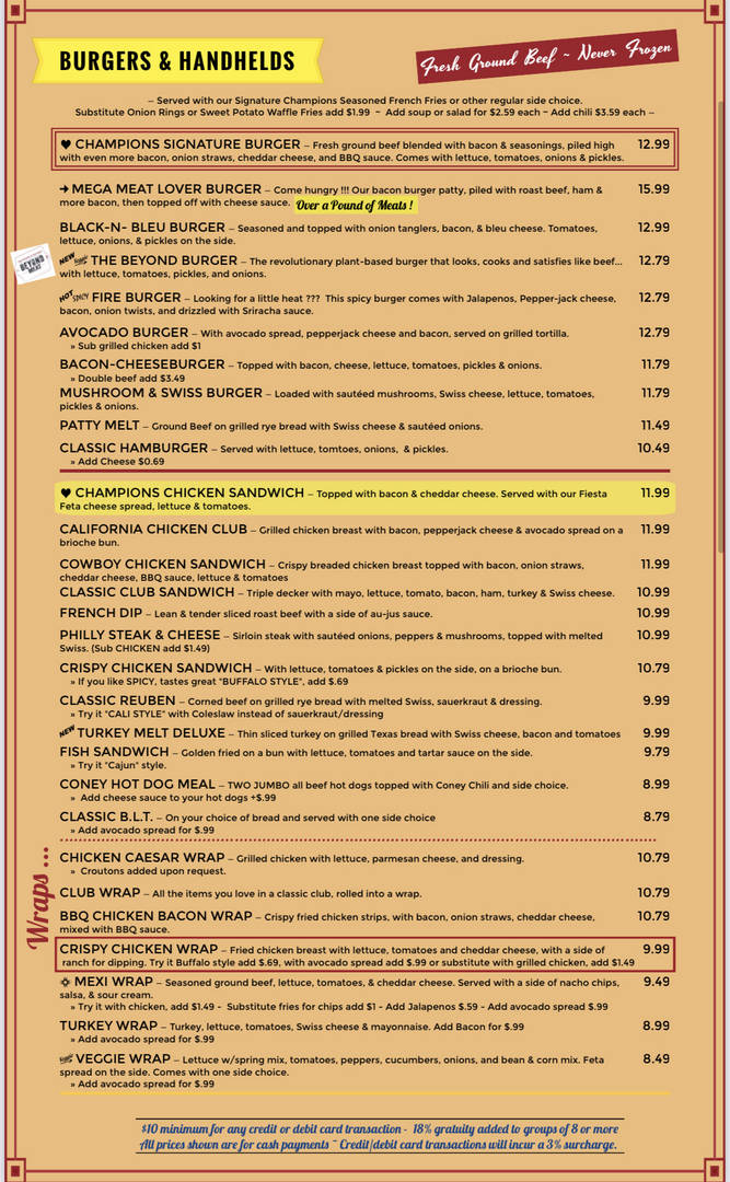 Pulled chicken salad OR tuna salad. Delivery Pickup Options - 36 reviews of Champs Sports Grill Went there to watch NFL NFC playoff game. ABOUT CHAMPS GRILL.