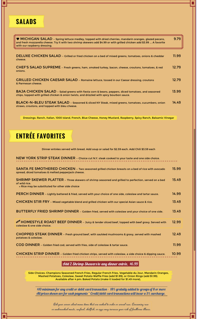 Champs Sports Grill Nutrition We would never take your money if we feel that we cannot do your work. As you can see from our page we offer a fun filled atmosphere with our friendly staff always happy to. Balsamic vinaigrette blue cheese ranch French honey mustard light Italian Thousand Island oil and vinegar and Greek vinaigrette.